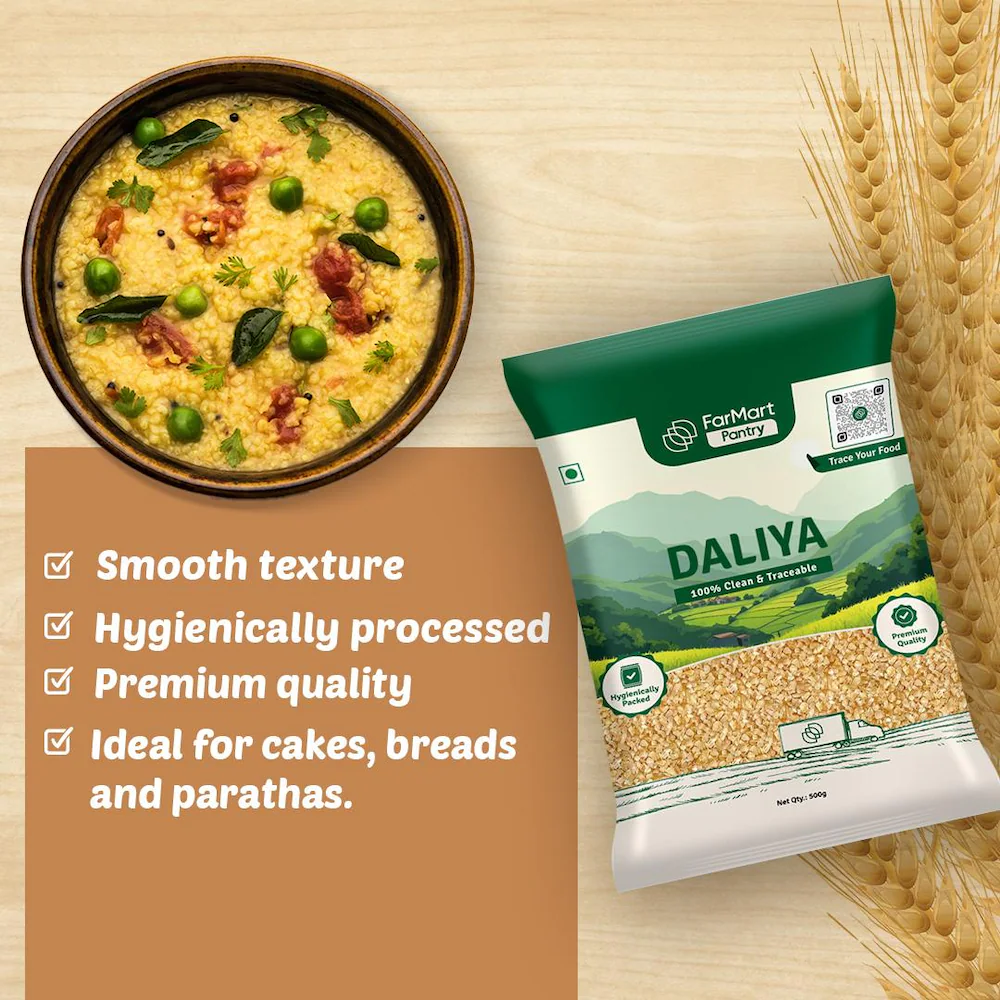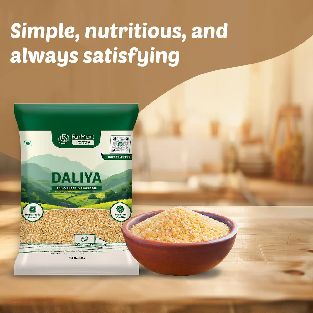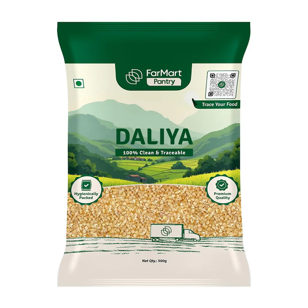 FarMart Pantry Daliya is a nutritious and versatile broken wheat that brings a perfect balance of taste and health to your daily meals. Carefully processed to retain its natural fiber, protein, and essential nutrients, this whole-grain staple is ideal for a variety of dishes, from hearty khichdi and nourishing porridge to savory upma and wholesome soups.