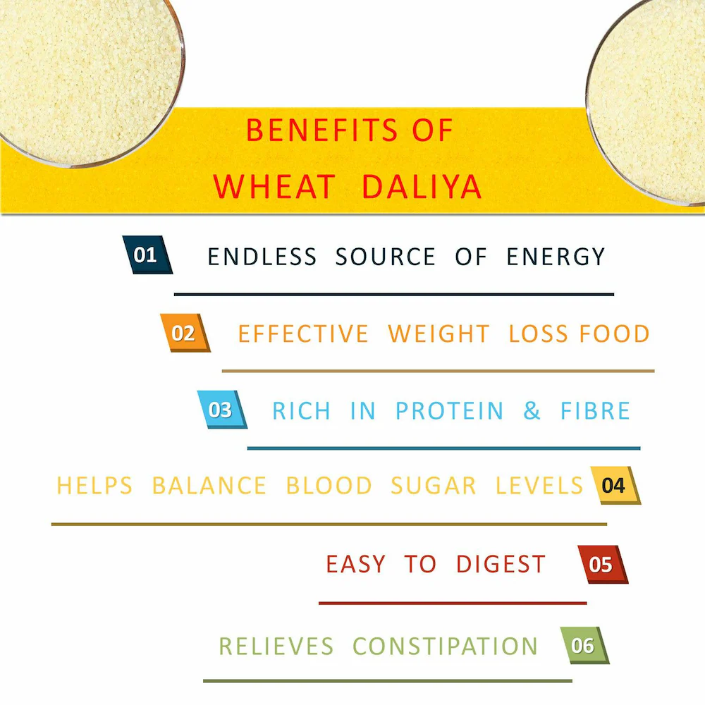 Dalia, well known as breakfast cereal, is an excellent source of protein. The Daliya should be eaten for weight loss because it gives a high protein diet and does not contain fats. Therefore, it is a safe, fat-free source of protein that must be included in everyday diet. This Dalia is packed with nutrients, fibre and manganese and has a natural taste flavor and aroma.