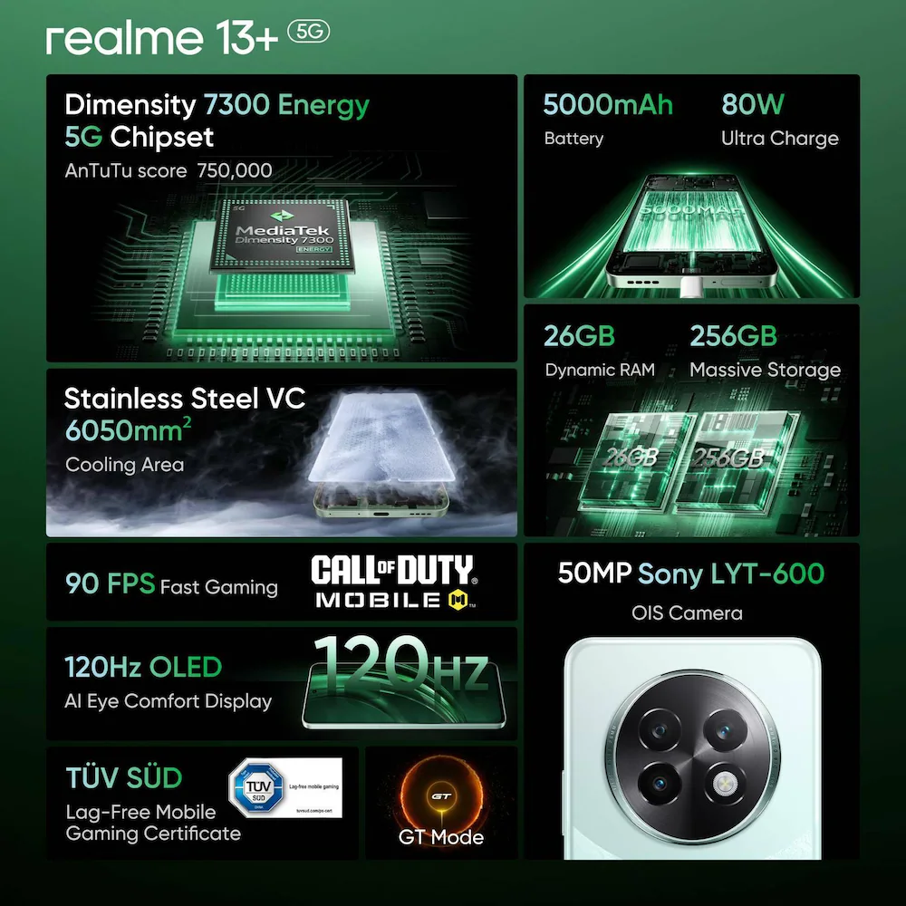 realme 13+ 5G, 8GB Ram, 128GB Storage, Speed Green, Smartphone