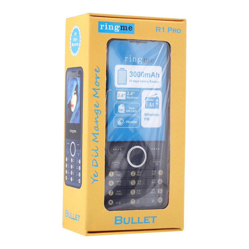 Z Ringme Bullet Mobile Phone. Box Contents – Mobile Phone, Battery, Charger. SIMs – Dual Sim. SIM Size – Normal. Other Features Call Features, Screen Size 2.4 inch, Display Type – QVGA, Connectivity – GSM. Extra Features – Wireless FM Radio. Connectivity Bluetooth. Battery Capacity: 3000 mAH. Battery Type – Li-ion Replaceable Battery. Talk Time – Up to 15 hours Standby Time Up to 240 hours. Dimensions HxWxD (mm) 115 x 50 x 12 mm. Warranty – 90 Days